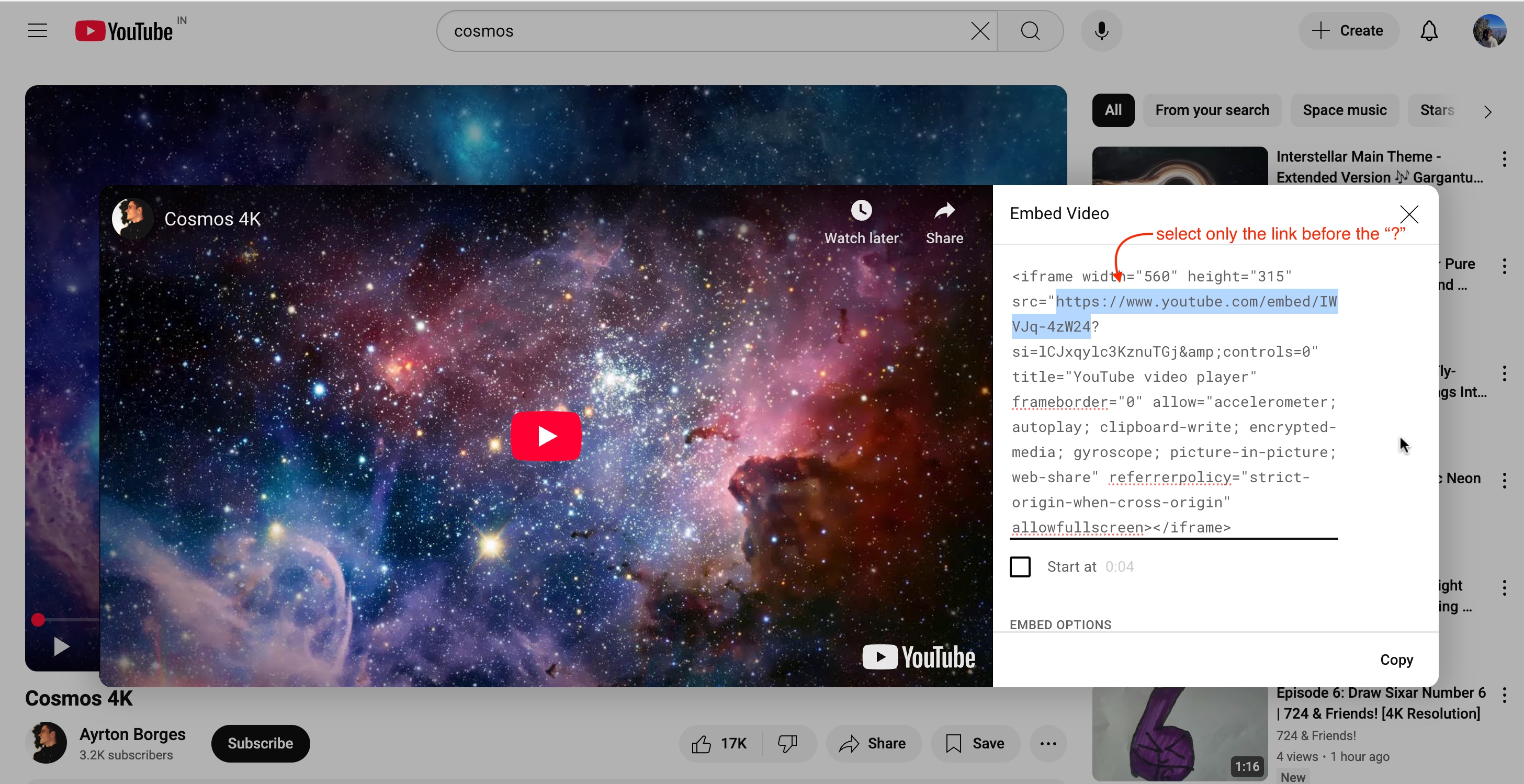 - Click on 'Embed' after you click 'share' of any of your desired youtube video.
