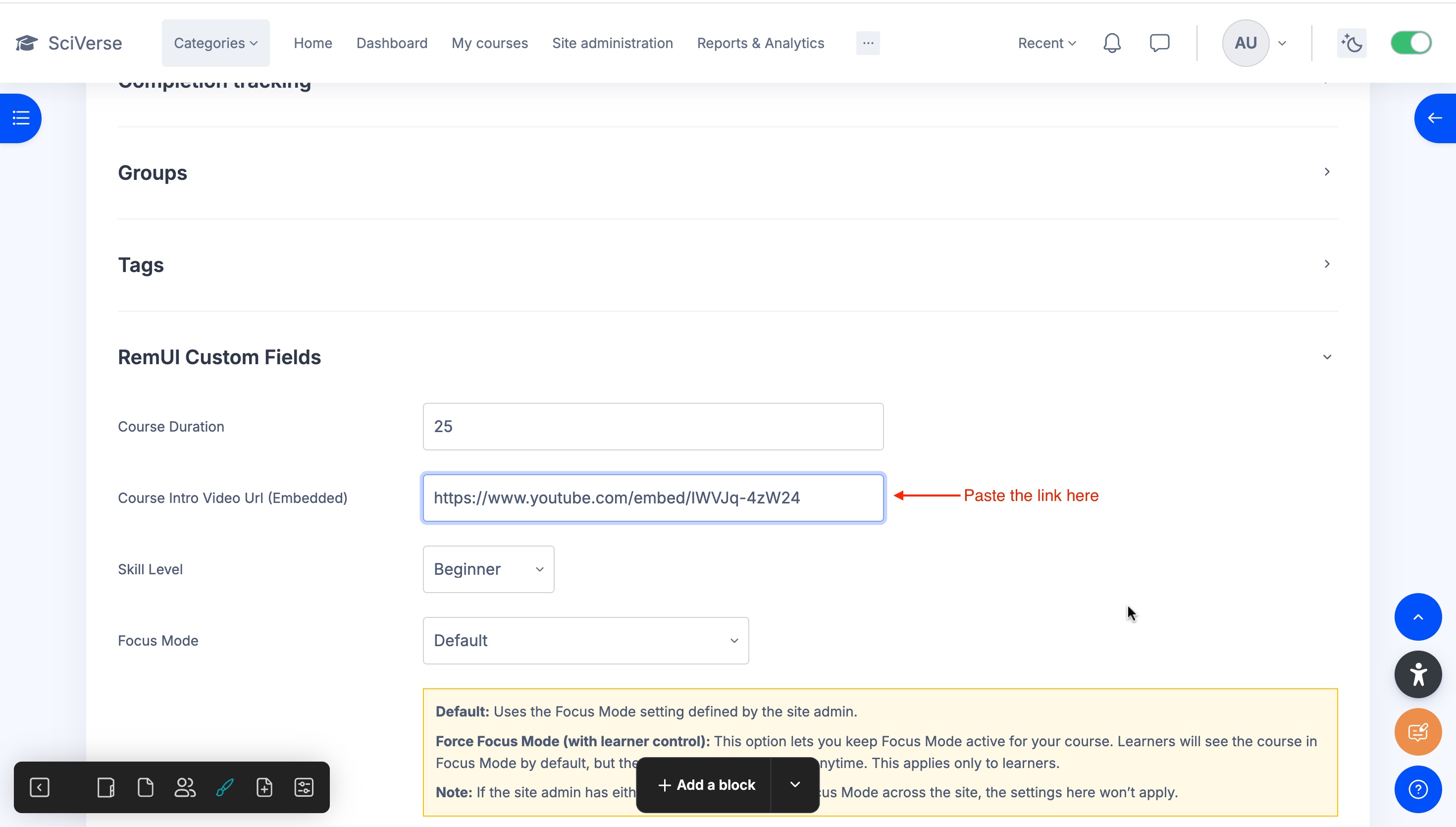 - Paste the selected part in RemUI custom fields —>Course Intro Video URL